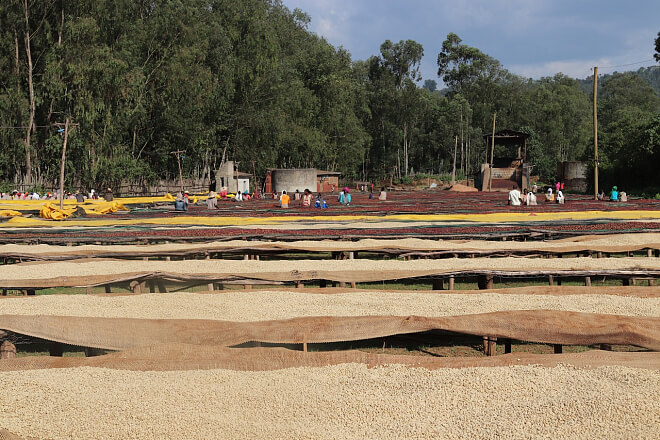 Po sběru jsou třešně doručeny na stanici, kde je přijímací pracovníci vizuálne prohlédnou a pro anaerobní fermentaci vyberou pouze ty zralé. Následně se třešně nasypou do plastových GrainPro pytlů, kde jsou uzavřené bez přístupu vzduchu a fermentují po dobu 18 – 24 hodin.Při anaerobní fermentaci je nejdůležitějším aspektem kontrola procesu. V uzavřeném prostředí mikroby rychle zkonzumují kyslík a prostředí se tak stane anaerobní, bez vzduchu. Začínají teda převládat mikroby, které se živí oxidem uhličitým a ty následně pohánějí fermentaci.Druhů mikrobů je nekonečně mnoho, každý z nich ovlivňuje fermentaci jiným způsobem a přináší do kávy nové chutě. Jedny z nejúžasnějších a zároveň i jedny z nejnepříjemnějších chutí, které jsme v kávě ochutnali, pocházely právě z experimentálních fermentací. Po fermentaci jsou třešně vyloupané na loupačce a přenesené do vykachlovaných fermentačních tanků (kachle mají ze Spojených arabských emirátů), kde jsou znovu pod vodou fermentované dalších 12 hodin. Následně je káva přenesena na africké postele, kde schne na slunci 15 dní.