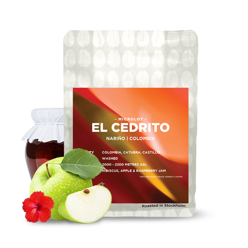 Výběrová káva Kolumbie EL CEDRITO z švédské pražírny Muttley & Jack's je charakteristická tóny ibišku, jablek a malinového džemu.