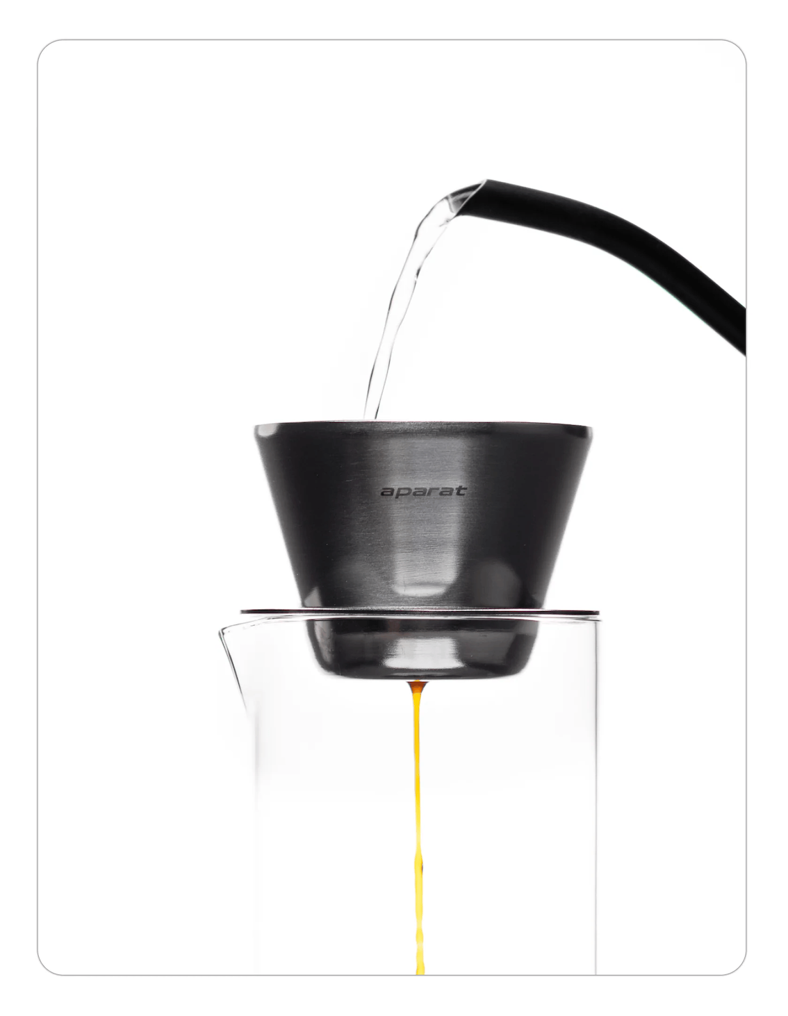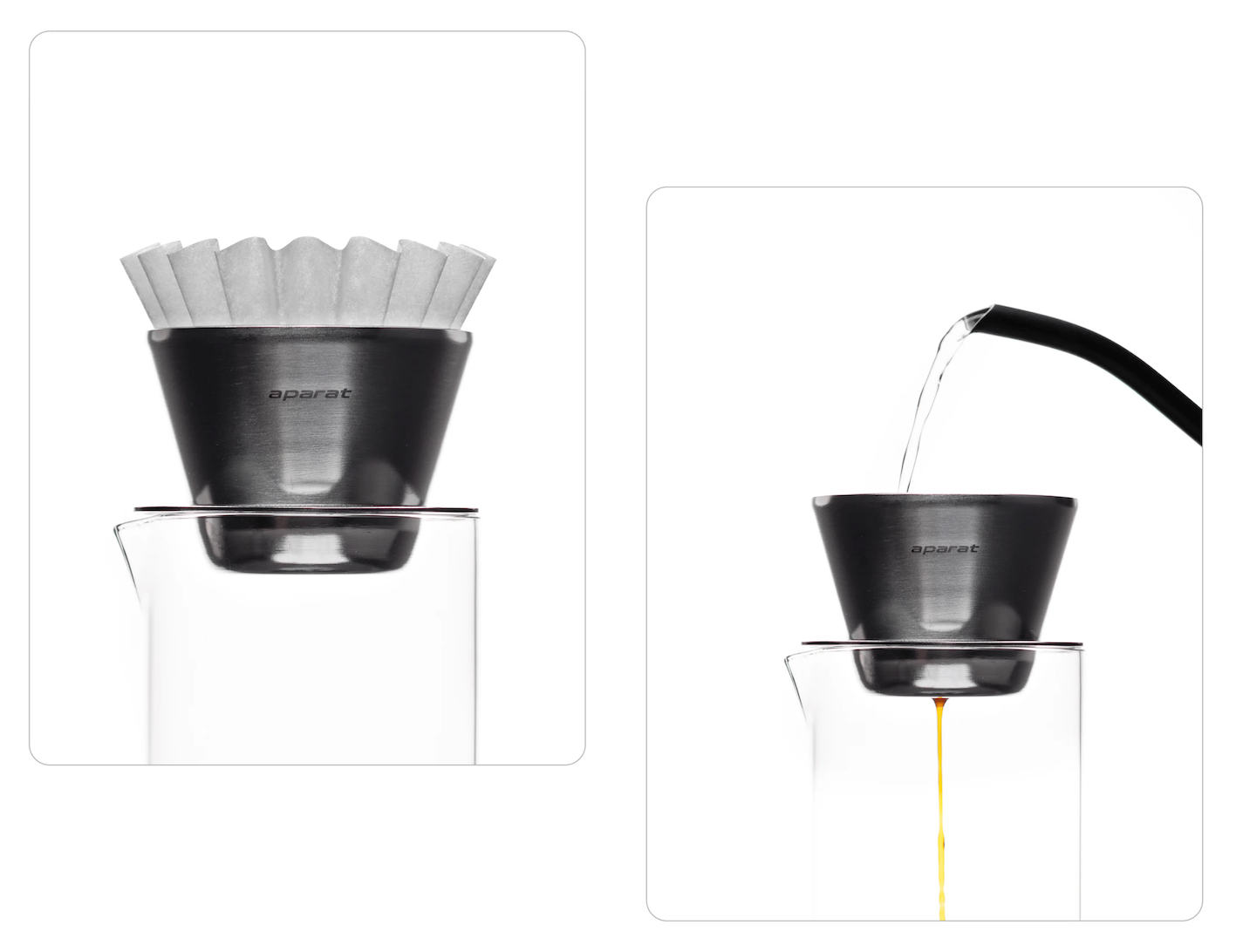 Dripper je maximálně univerzální. Rozumí si s klasickými vlnitými filtry (vel. 155) pro lehčí šálek i s plochými filtry pro intenzivnější extrakci. Vnitřní stěna je elektrolyticky leštěná, aby neovlivňovala chuť kávy, a celý přístroj můžete bez obav mýt v myčce.